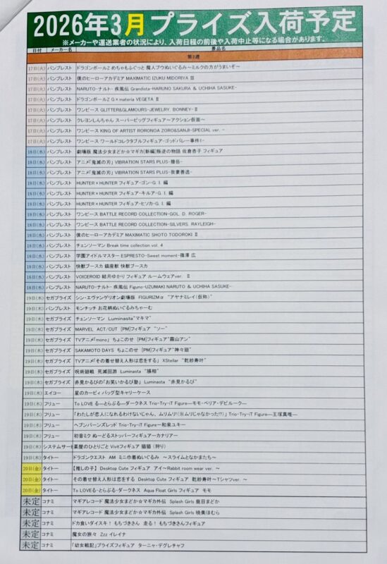 また、後日入荷や延期が決まった景品は反映されません。