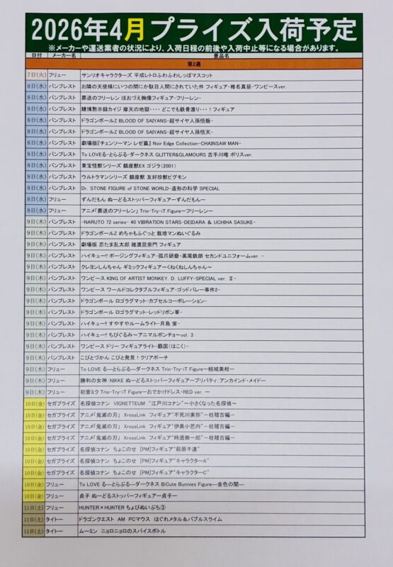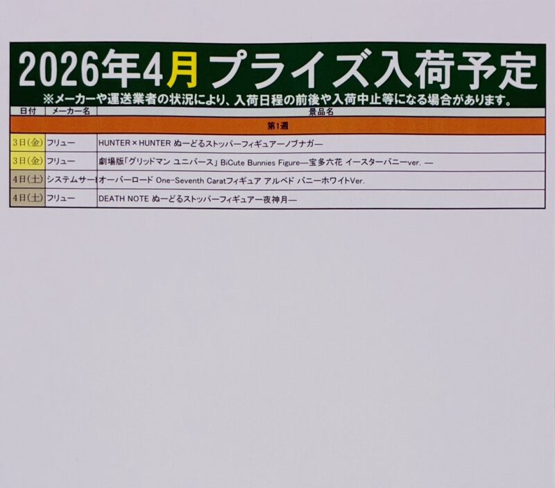 また、後日入荷や延期が決まった景品は反映されません。