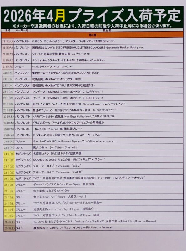 4月プライズ入荷予定❗️