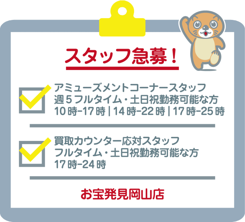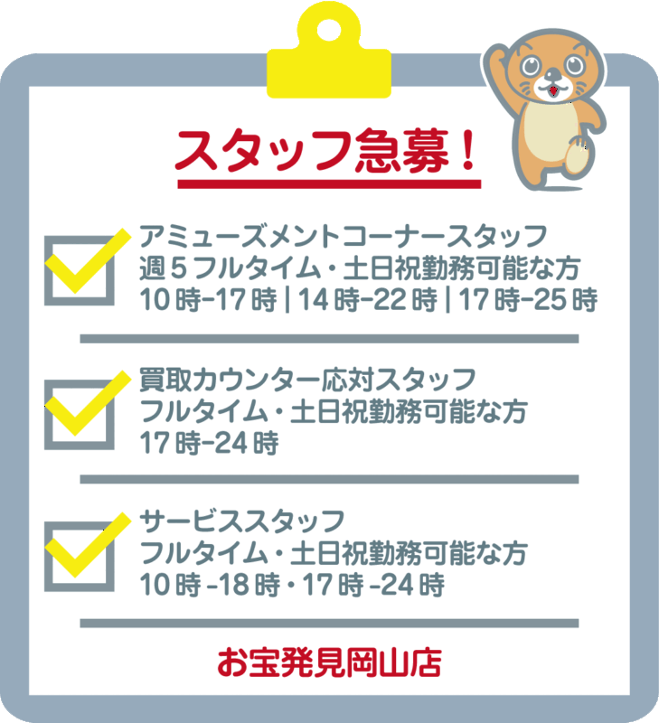 | 勤務地 | お宝発見岡山店 (岡山市南区当新田121-1) |